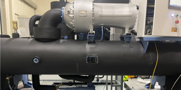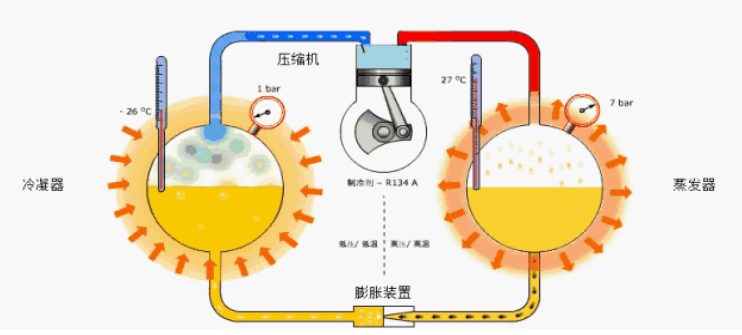 蒸發(fā)冷一體機(jī)的壓縮機(jī)將蒸發(fā)器的低溫低壓制冷劑氣體吸入,壓縮成高溫高壓氣體,再排入冷凝器,與冷媒水進(jìn)行熱交換而成為低溫高壓的制冷劑液體。